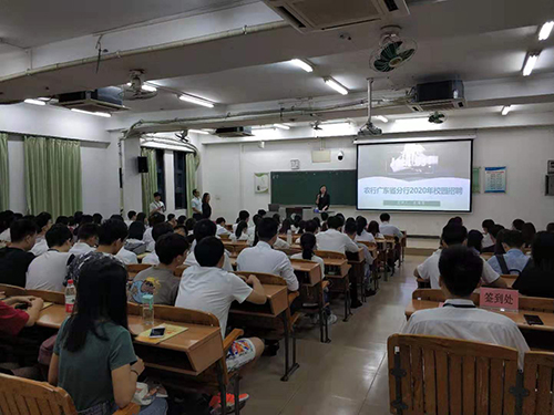 2019年10月11日中国农业银行广东省分行在华南农业大学第四教学楼207室举办宣讲了农行广东省分行校园招聘会。招聘会主要分为四个环节,分别是农行介绍、2020年校园招聘安排、职业发展及薪酬待遇、答疑环节。当天约有100余名面试者到场,现场座无虚席。