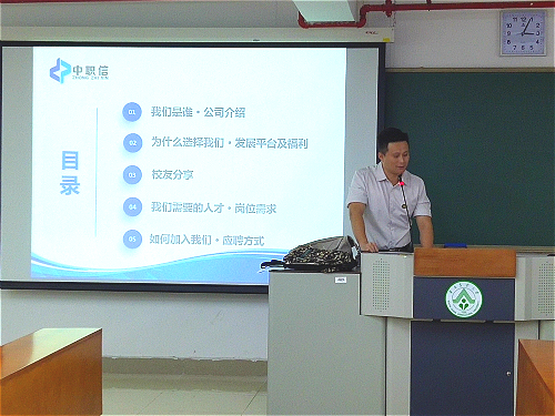 此外,由校友师姐给同学们分享她的求职和工作经历,并谈及了中职信有较好的资源可供员工学习。然后,中职信另一位员工上台介绍了企业所需招聘的岗位和参与应聘的方式,还着重说明了应聘者需知的注意事项。