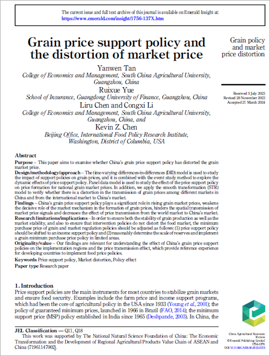 近期,经管学院谭砚文教授团队在国际知名期刊China Agricultural Economic Review(CAER)发表论文“Grain price support policy and the distortion of market price”。