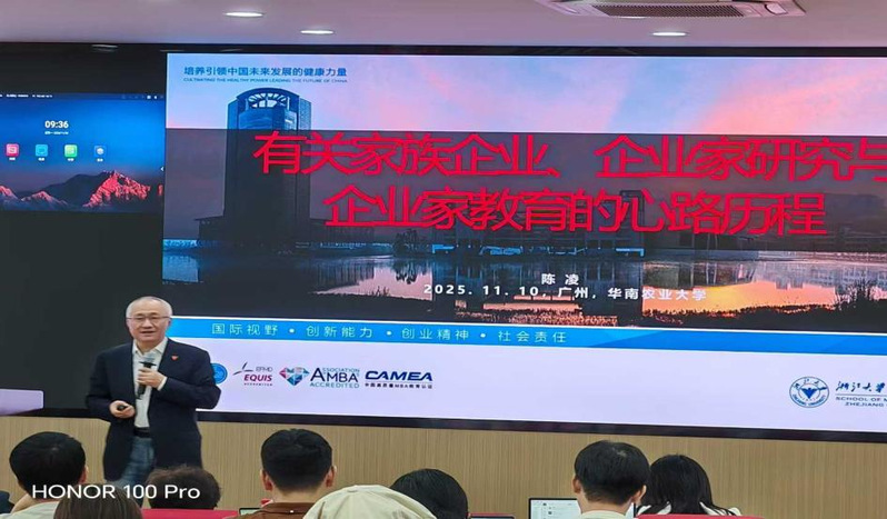 2025年11月10日上午,浙江大学管理学院企业家学院院长、浙江大学全球浙商研究院副院长,全国工商联私营经济研究会家族企业发展委员会副会长陈凌教授,受邀为我师生做题为“有关家族企业、企业家研究与企业家教育的心路历程”的学术讲座。本次讲座聚焦家族企业领域前沿研究与实践探索,为师生搭建了与领域专家深度交流的学术平台。